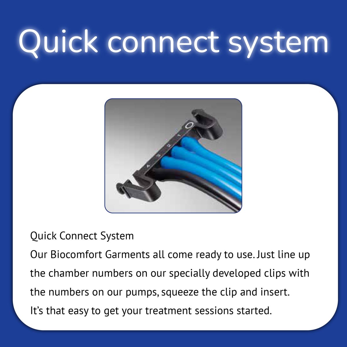 Our Biocomfort Garments all come ready to use. Just line up the chamber numbers on our specially developed clips with the numbers on our pumps, squeeze the clip and insert. It’s that easy to get your treatment sessions started.
