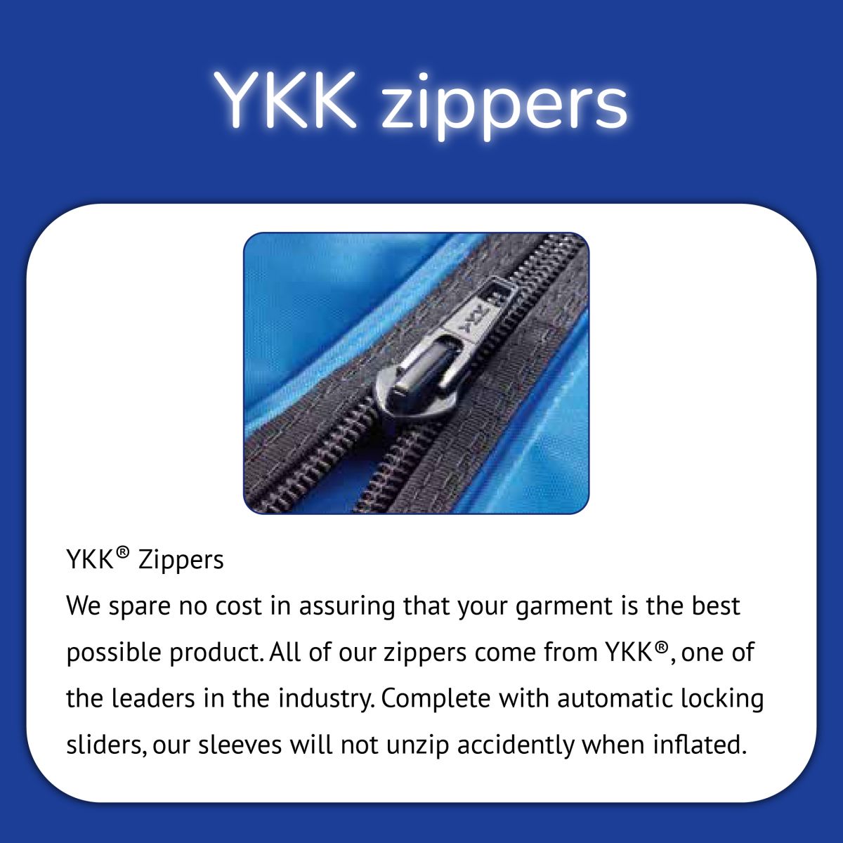 We spare no cost in assuring that your garment is the best possible product. All of our zippers come from YKK®, one of the leaders in the industry. Complete with automatic locking sliders, our sleeves will not unzip accidently when inflated.
