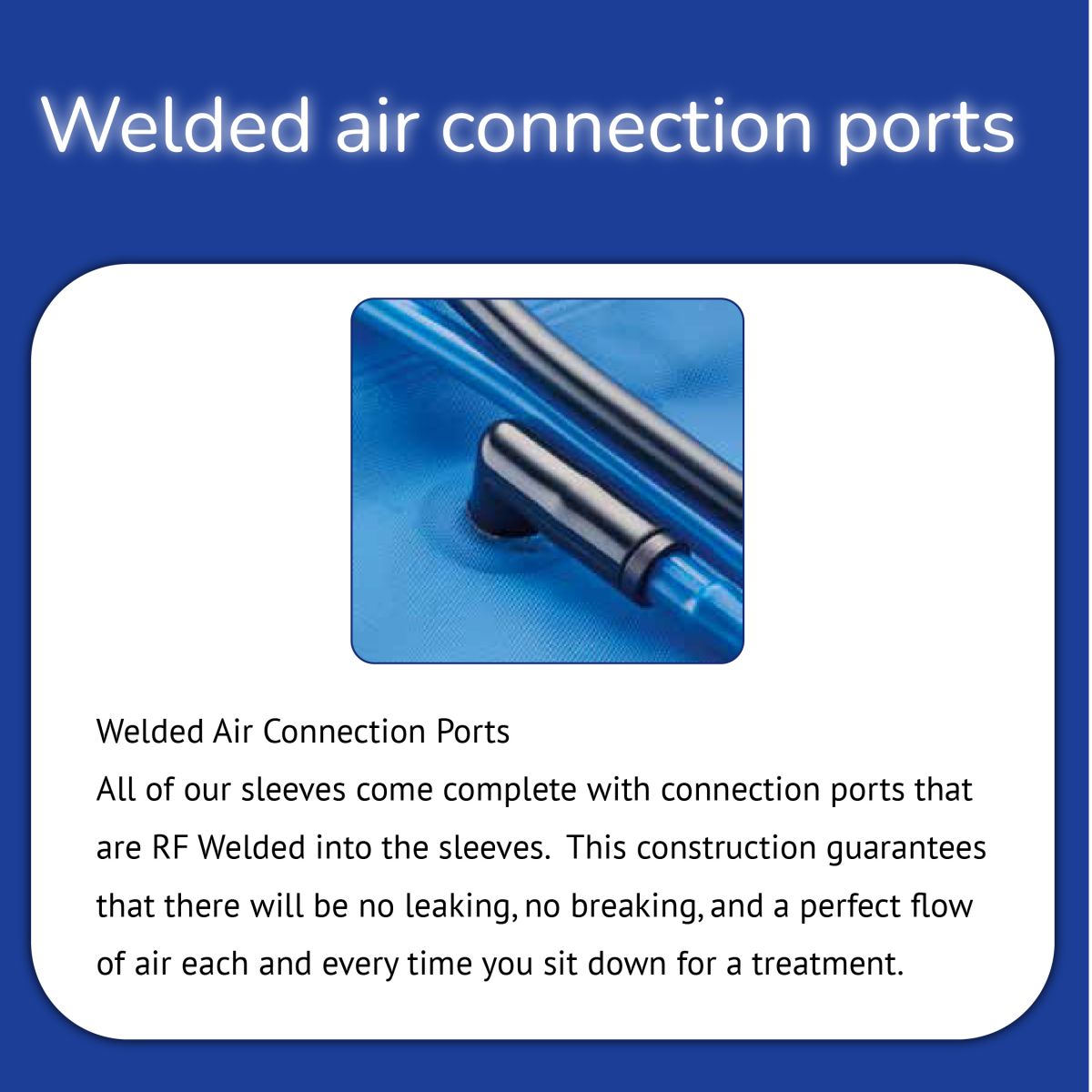 All of our sleeves come complete with connection ports that are RF Welded into the sleeves.This construction guarantees that there will be no leaking, no breaking, and a perfect flow of air each and every time you sit down for a treatment.