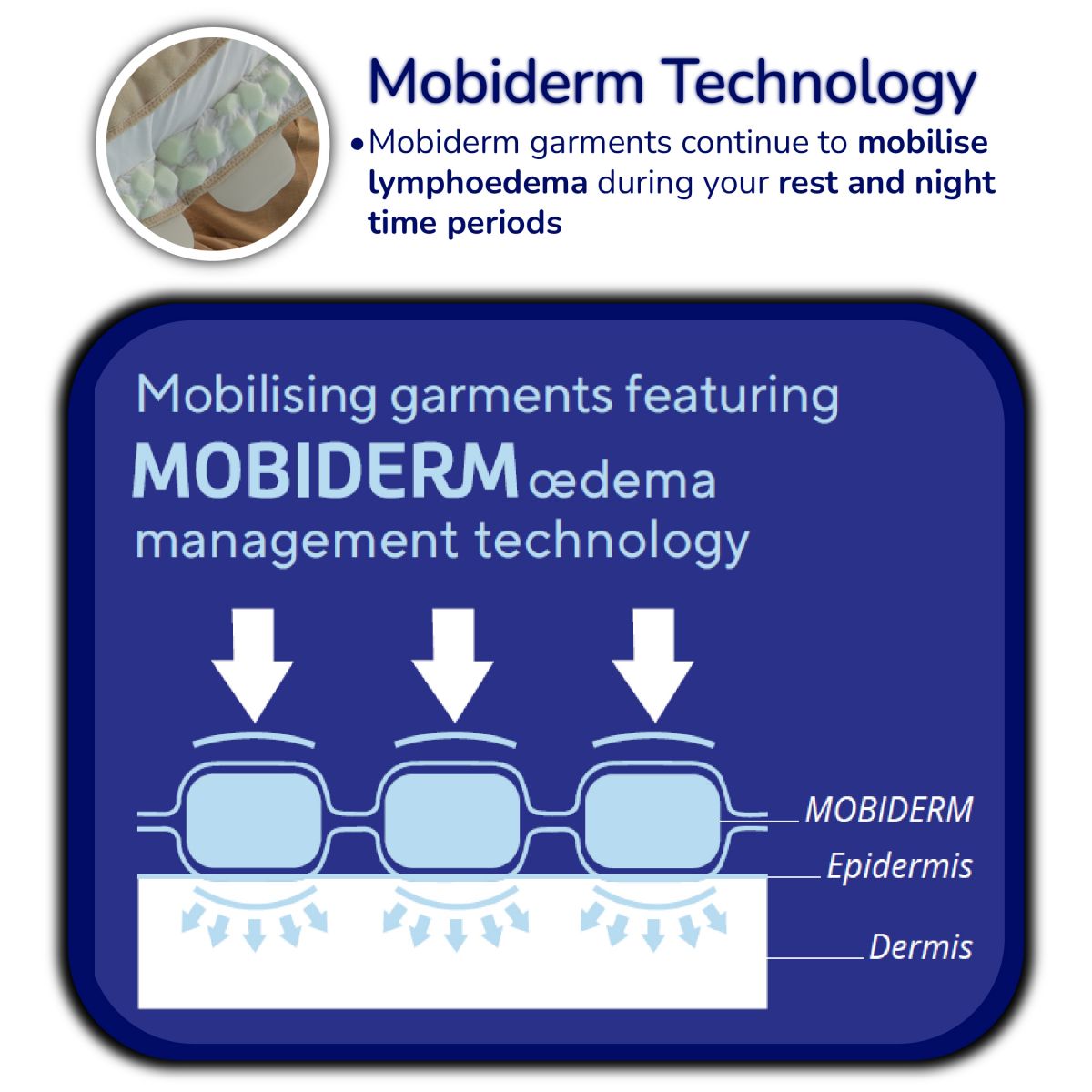 • subcutaneous drainage via MOBIDERM technology consisting of foam blocks positioned randomly between two sheets of non-woven material. In contact with the skin, the blocks provide a pressure differential between the contact area beneath them and their periphery, creating multi-directional circulation channels for lymph under the skin. The lymph travels from the areas pressed by the blocks towards the free areas. Efficient lymph drainage and circulation is thus promoted. The garments are designed to be worn day and night.