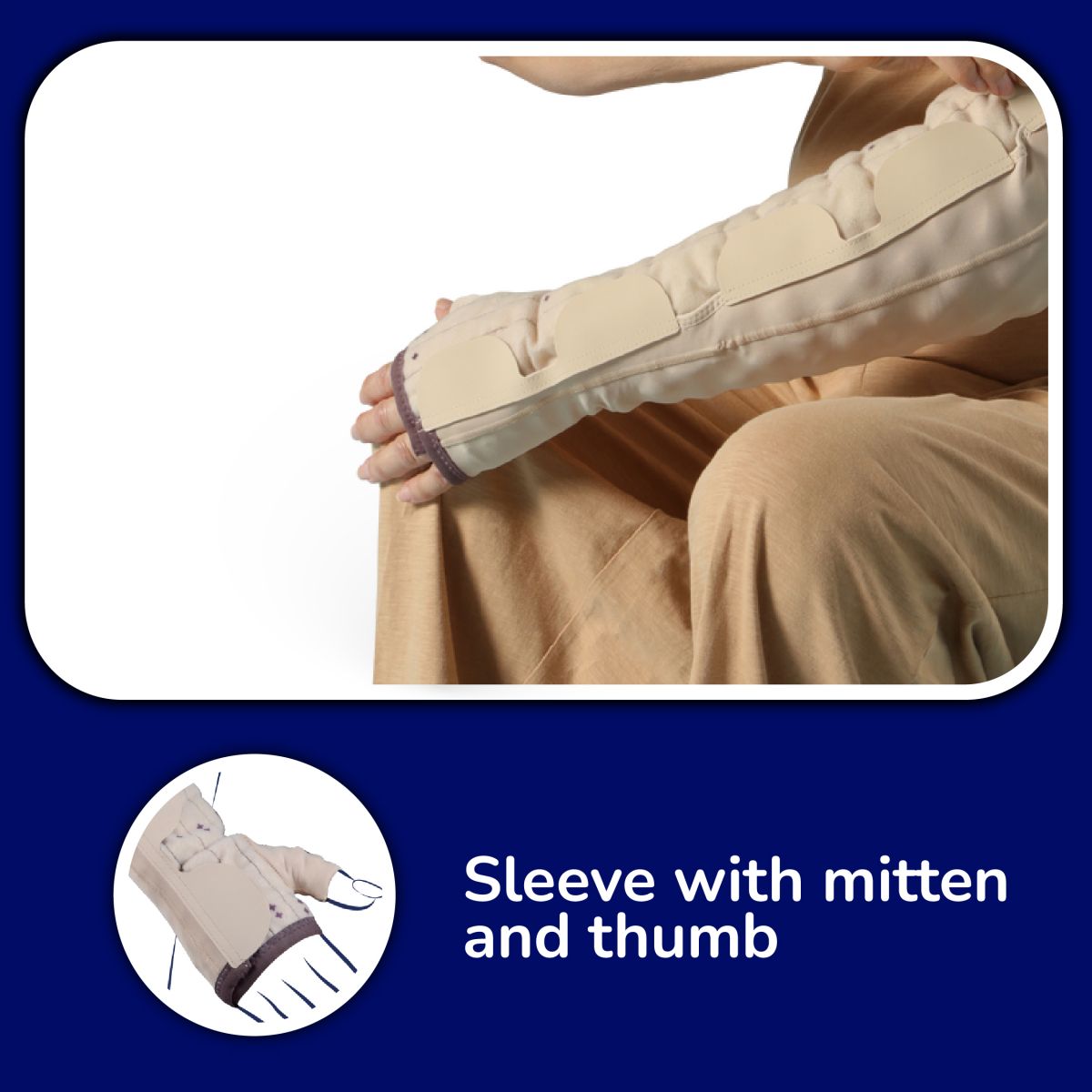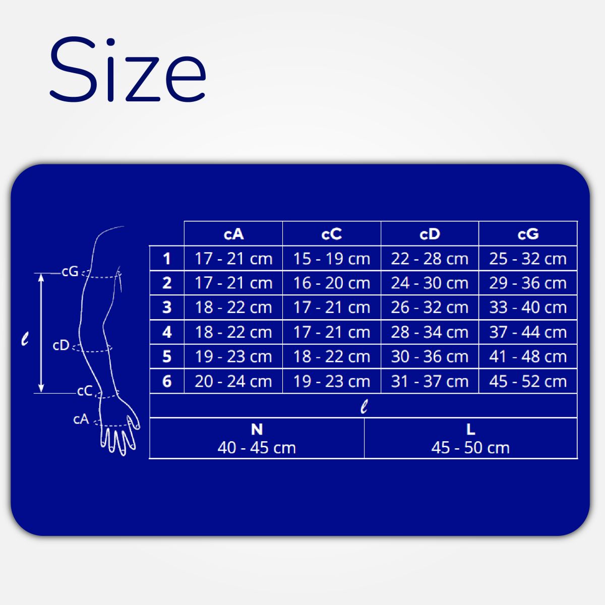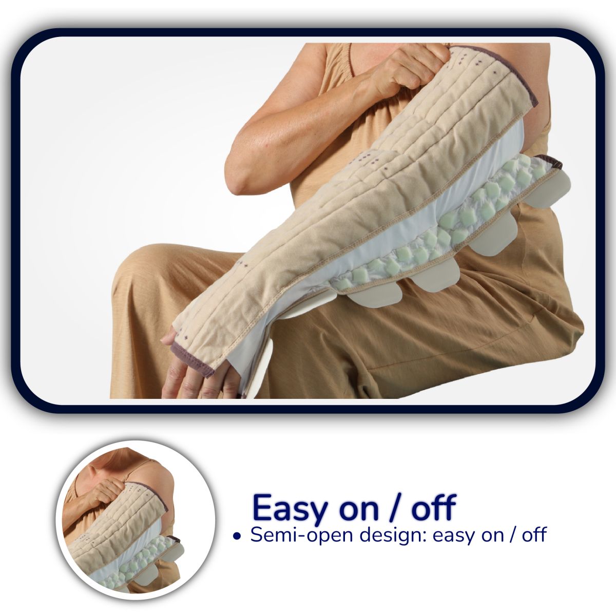 • On the external surface, of two beige-colored, soft, elastic materials (polyester, cotton, elastane, polyamide) and hook-and-loop fasteners (PVC, polyamide, polyurethane), allowing the garment to be adjusted to limb volume. Two sizes of foam block are used depending on the body area treated: small blocks (5 x 5 mm) on the hand and foot, big blocks (15 x 15 mm) on the leg and arm.