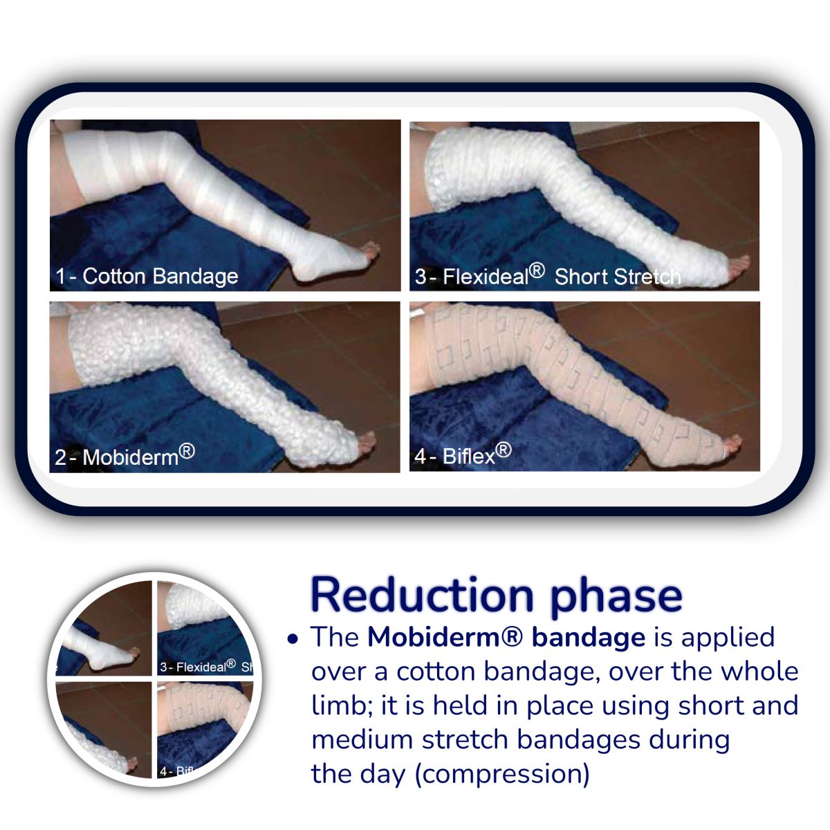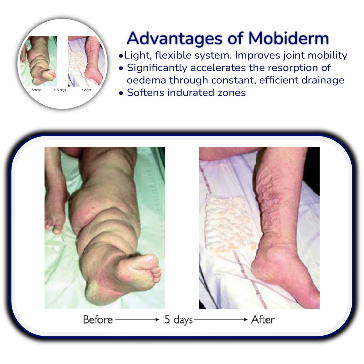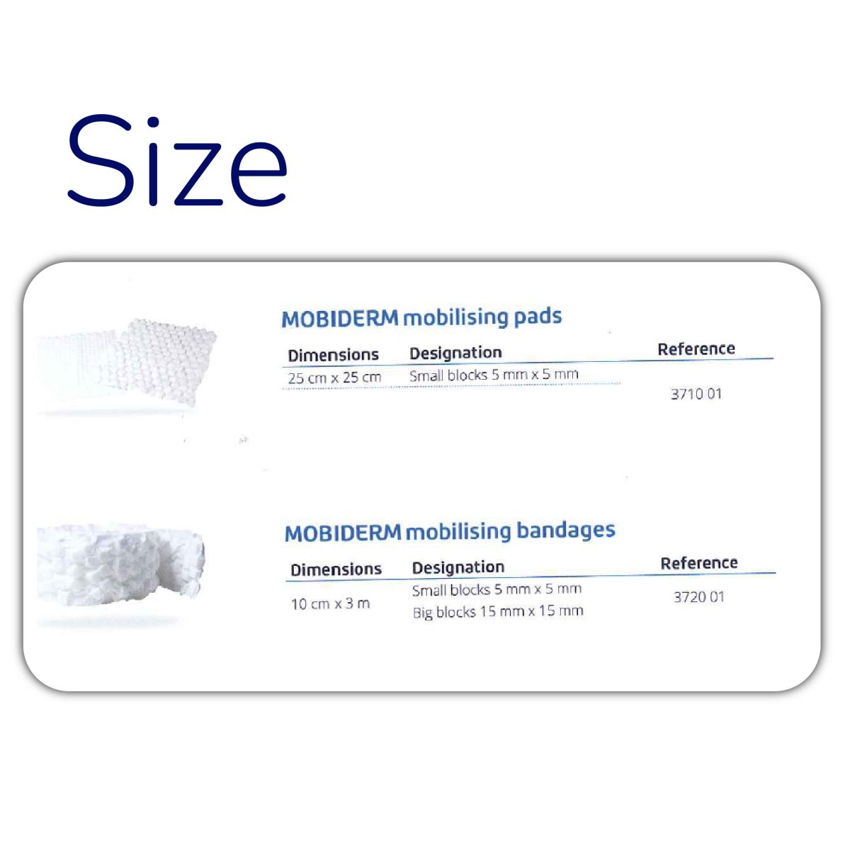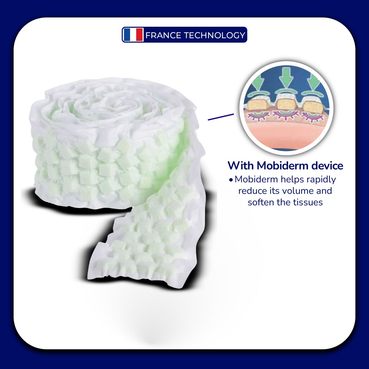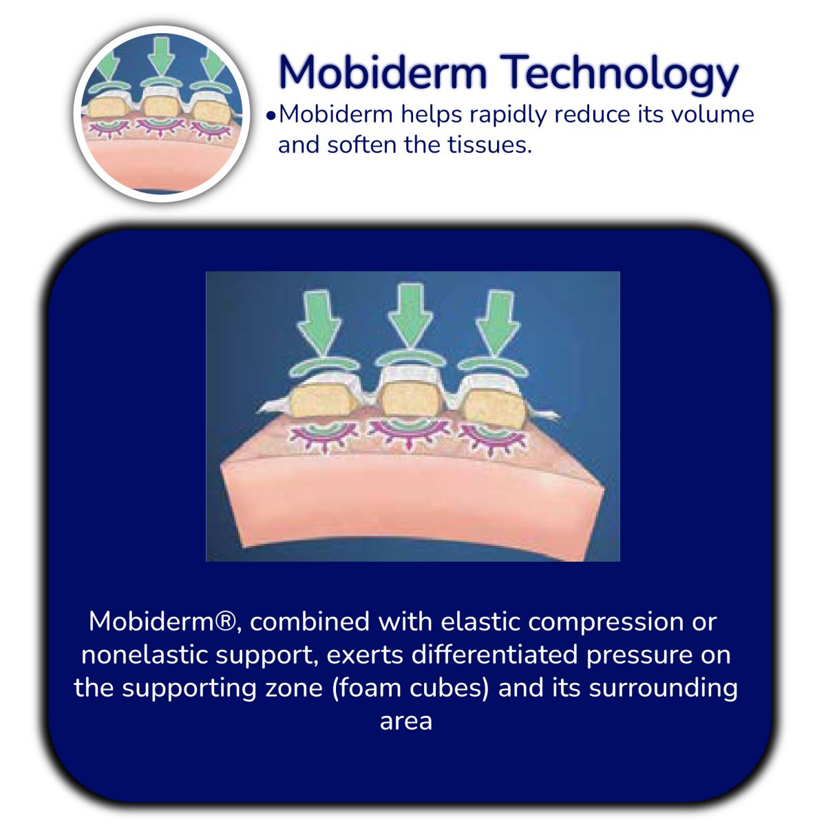 Mobiderm® is composed of foam blocks encased in a soft adherent webbing, which creates a pressure differential between the supporting zone and the surrounding area.  Combined with muscle volume variations, triggers a shear effect in the subcutaneous tissues concerned. Used under a reducing bandage, the technology mobilizes oedematous or indurated subcutaneous tissue.