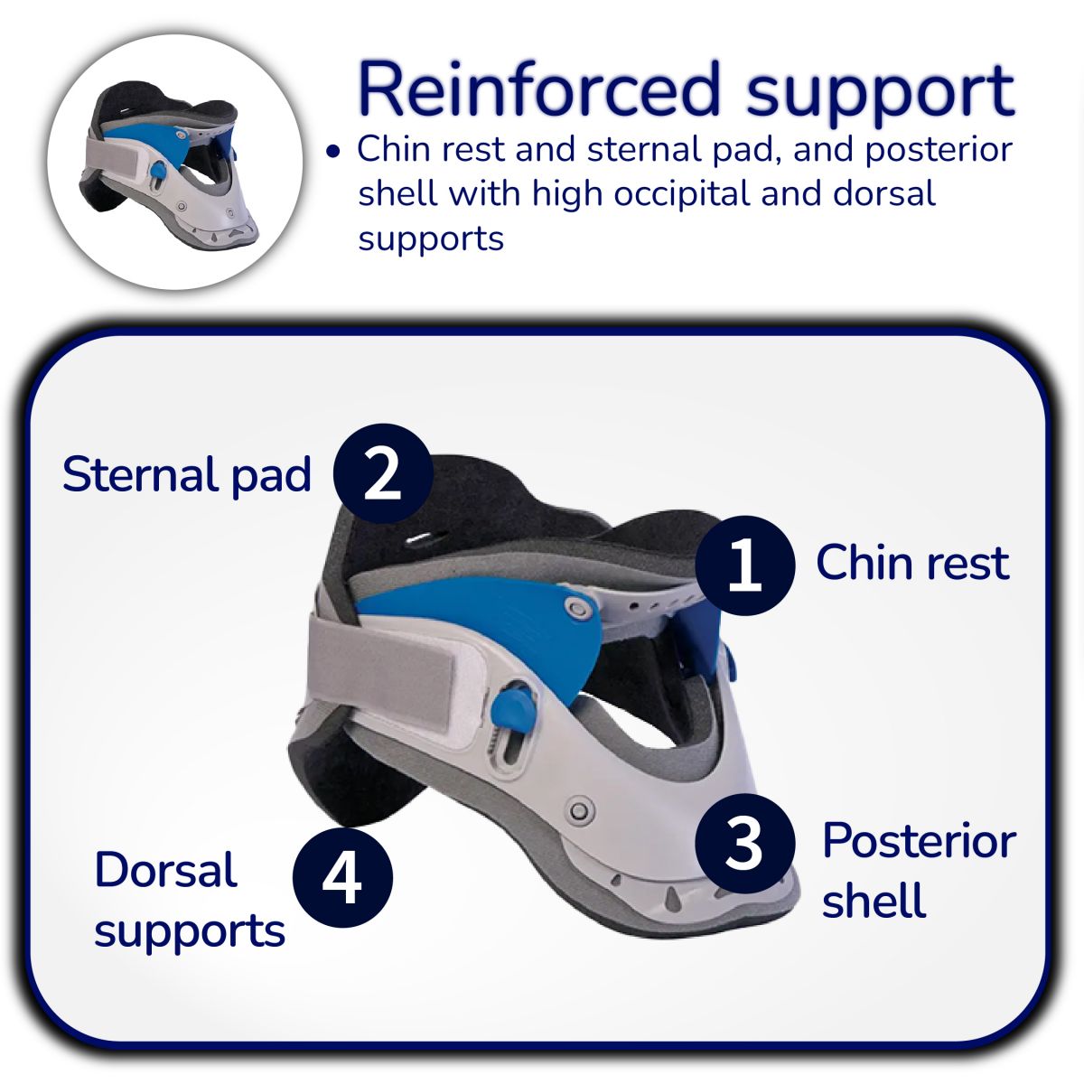 1. Reinforced support: rigid structure combines anterior shell with chin rest and sternal pad, and posterior shell with high occipital and dorsal supports.