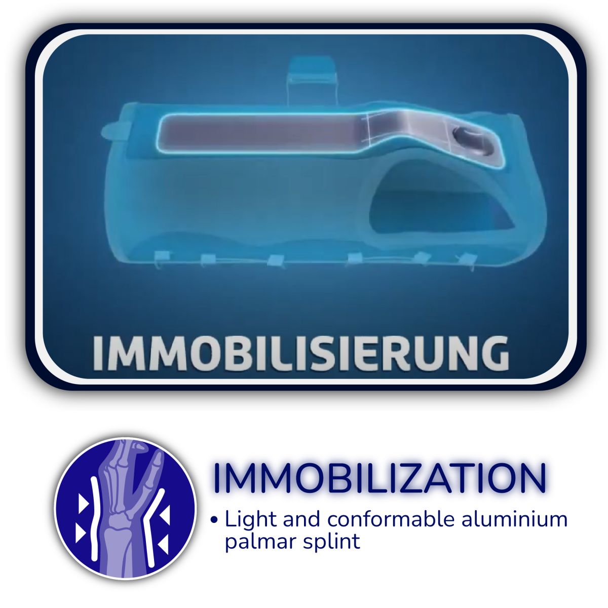 • Immobilisation: rigid, anatomical, and conformable palmar stay restricts joint movement.