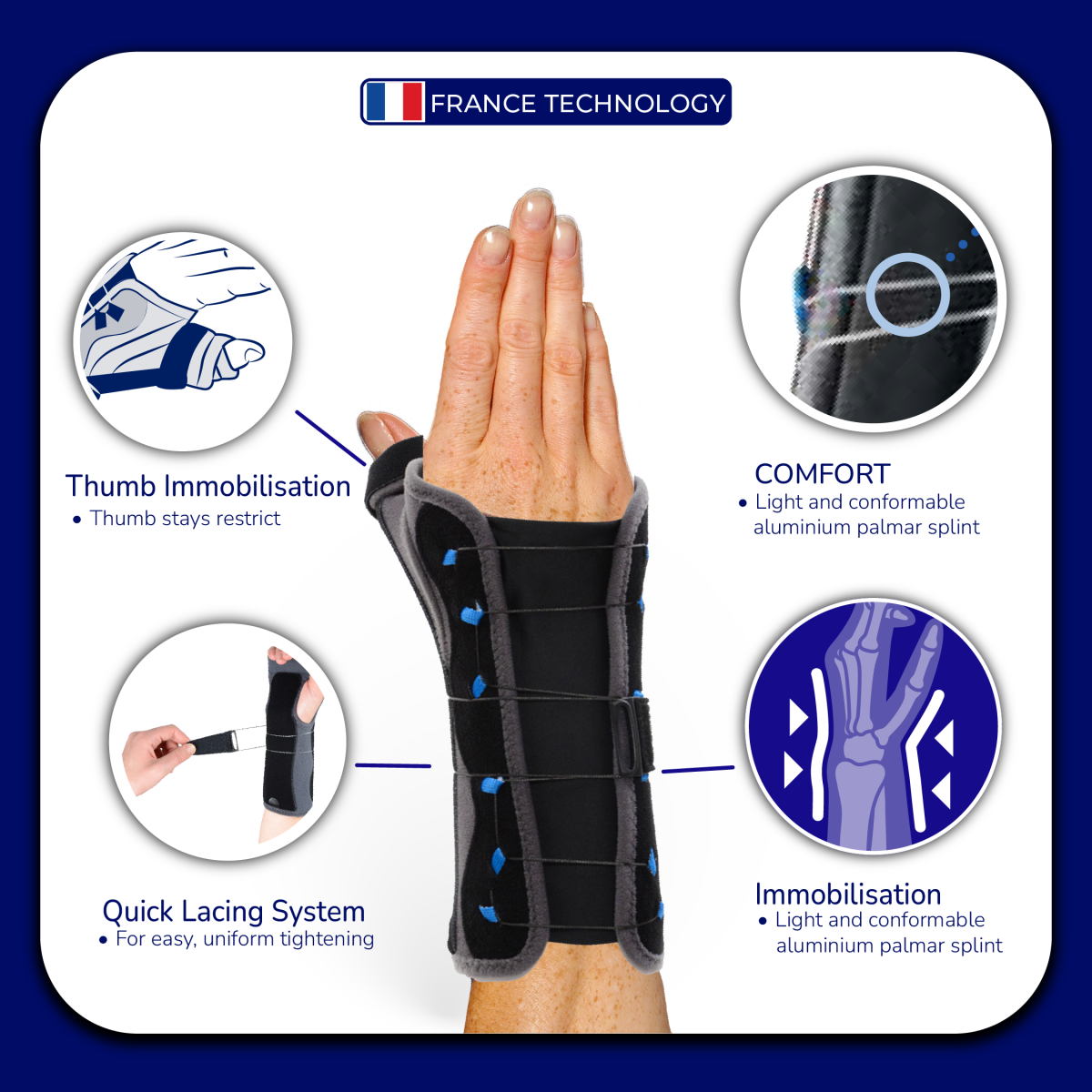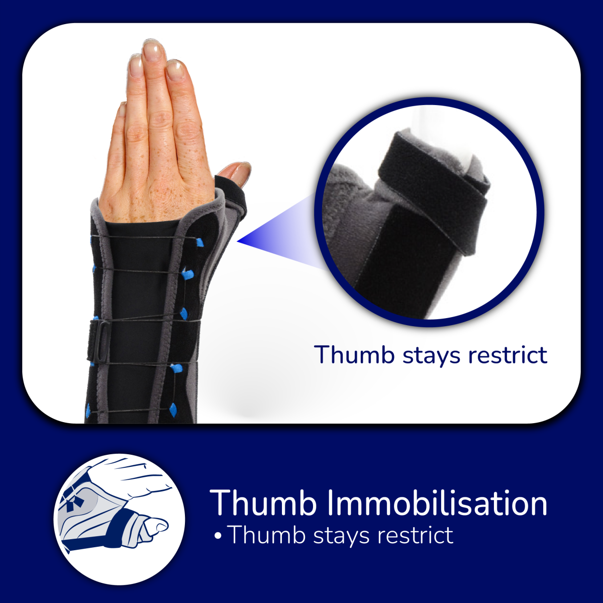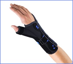 • Immobilisation: rigid, anatomical, and conformable palmar and thumb stays restrict wrist and thumb joints movements.